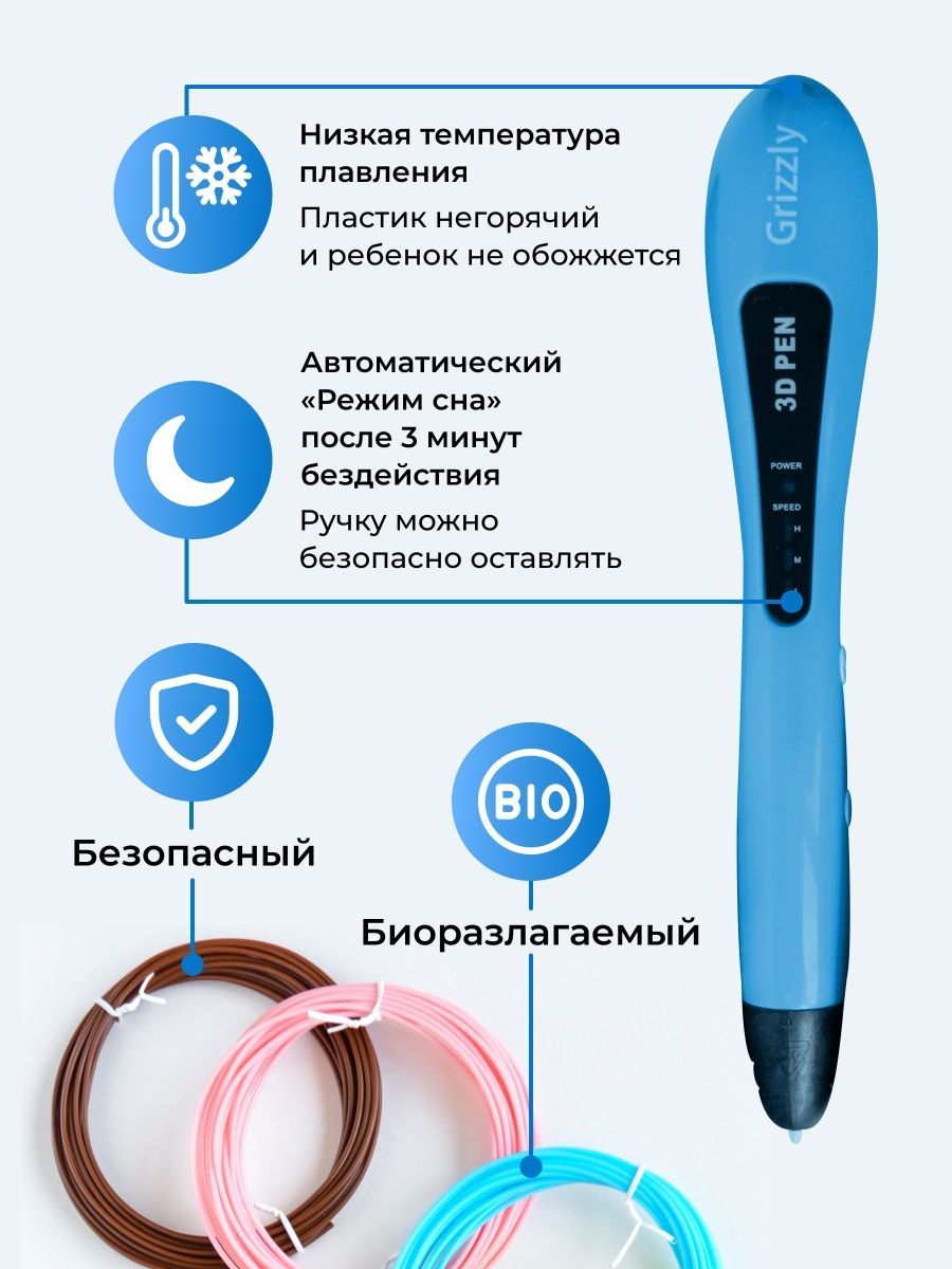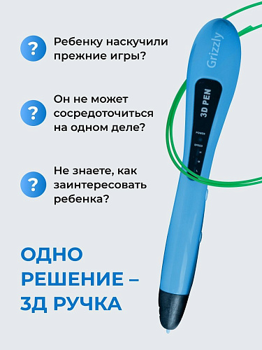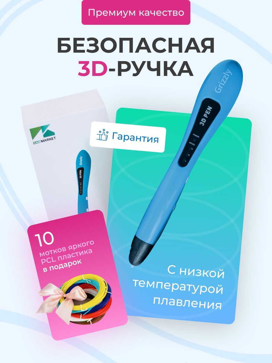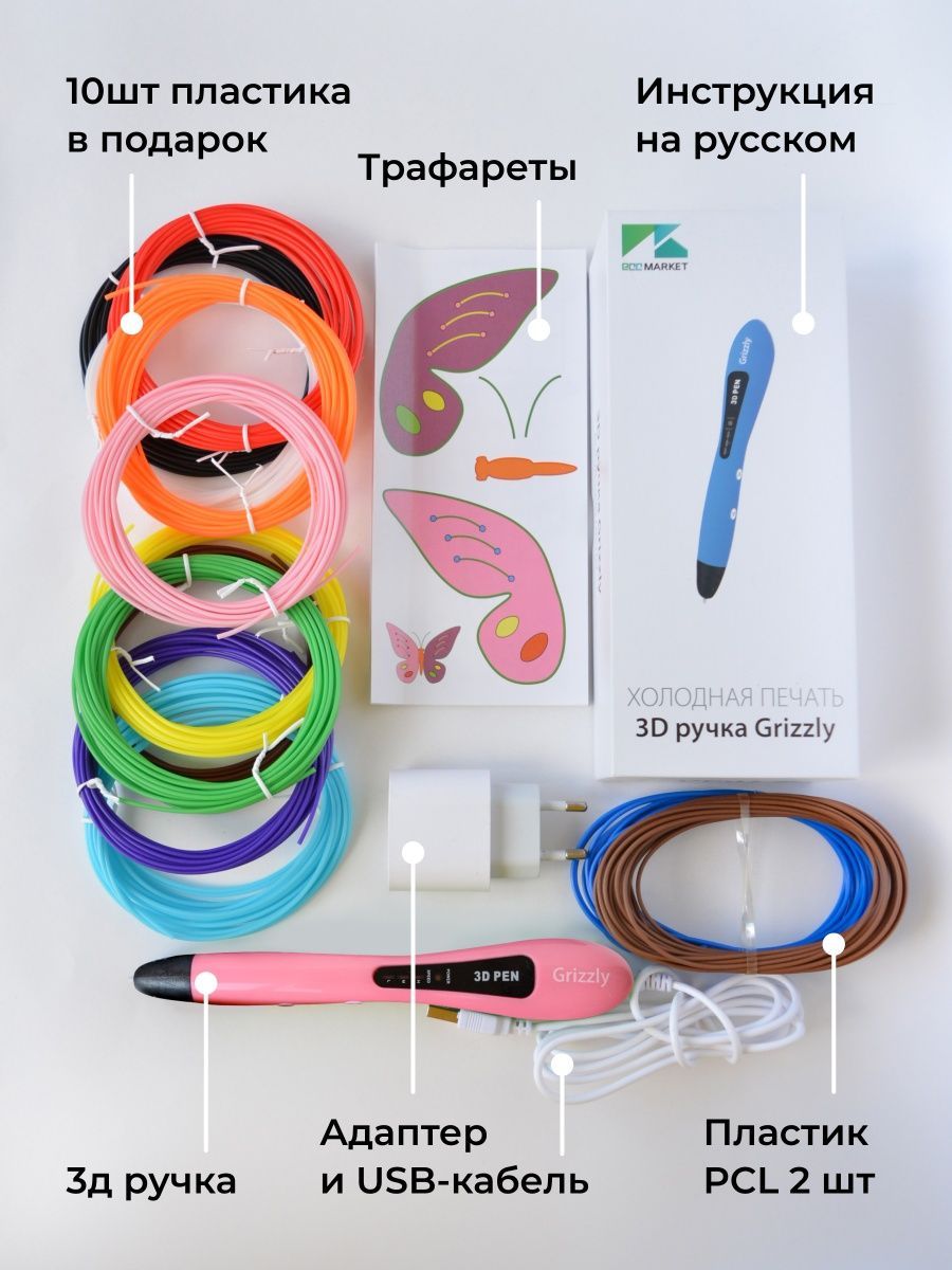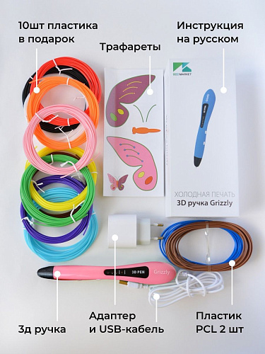 Набор 3 Д печати - это ручка Gizzly и цветной PCL пластик. В отличие от других 3д ручек, сопло Гризли нагревается не так сильно: температура пластика на выходе около 40 градусов.