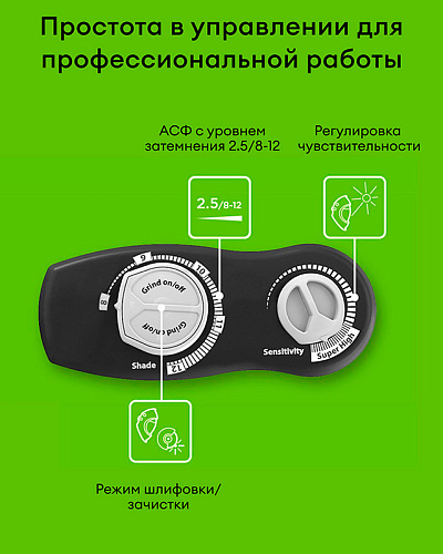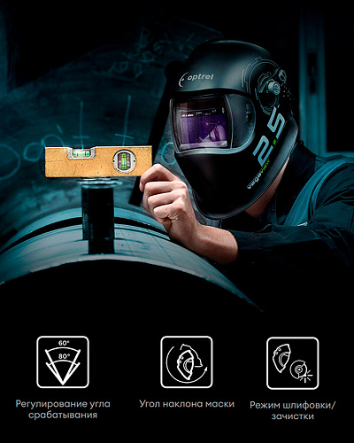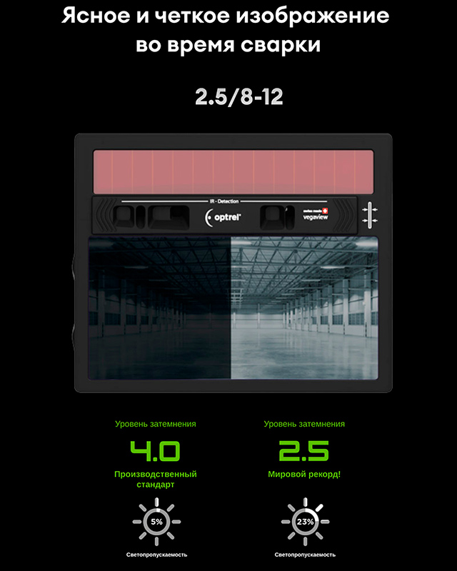 Премиальная сварочная маска хамелеон обеспечивает максимальный уровень защиты и лучший обзор. Яркий и динамичный автоматический светофильтр, вместе с уровнем затемнения 2,5 DIN создает все условия для полноценной работы. Теперь не нужно постоянно поднимать и опускать сварочный щиток, чтобы выполнить промежуточные работы. Видимость в маске позволяет делать все это без лишних движений, экономя время и силы пользователя. Маска хамелеон для сварки Optrel Vegaview 2.5 – это настоящий прорыв в индустрии.