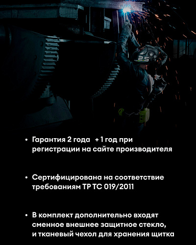 Комплектациясварочная маска, инструкция по эксплуатации, сумка для хранения, элементы питания CR2032, гарантийный талон, одна внешняя защитная линза, силиконовая накладка и тканевый мешочек для хранения щитка.
